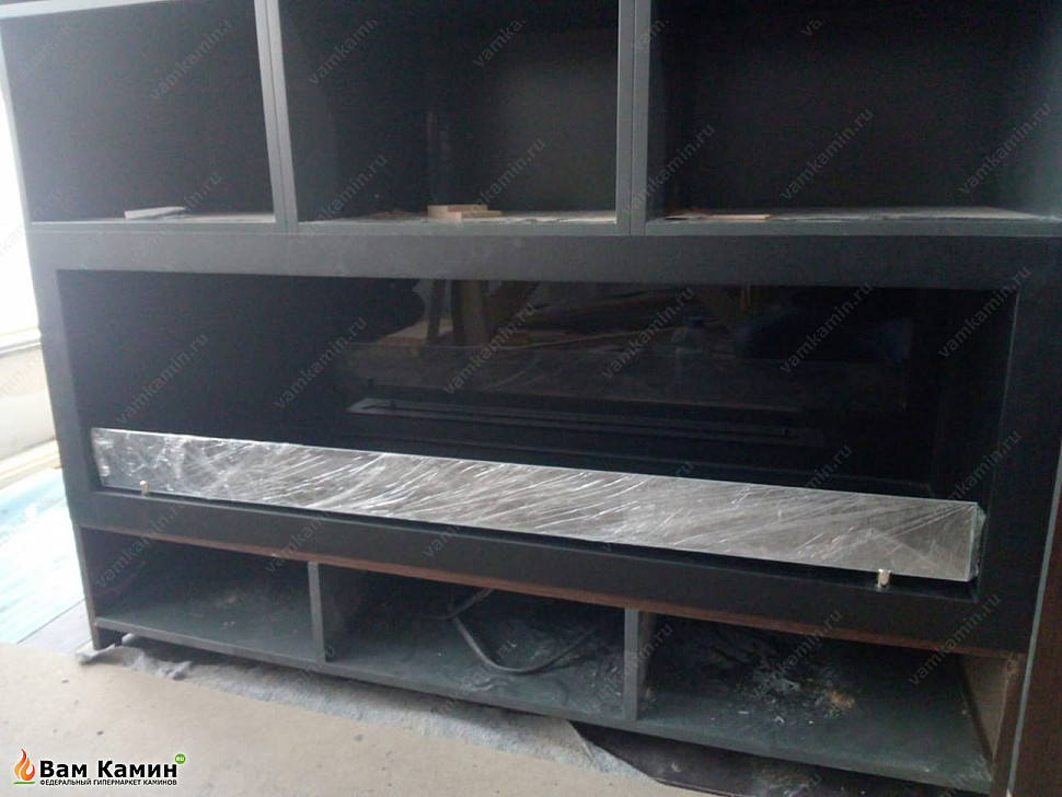 На фото биокамин в нишу SteelHeat ONE 1400 во время ремонта. При этом видно, что сам биокамин уже установили в мебельную стенку. Не зря считается, что экокамин - это универсальный аппарат, который можно встраивать не только в стены и ниши, но и в мебель. Стальной очаг биокамина SteelHeat не подвержен деформациям. Его толщина 2,5 мм. Цельносварную конструкцию корпуса на этапе производства также проверяют ультразвуком.
